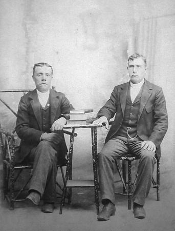 'Hansos' Hannes och Alfred Åkerman hemma i Singsby igen. Johannes Åkerman (1862-1942) var dräng hos Johannes Johan Eriksson Lithén (Bäck) en tid innan han for till Amerika 1888. Han var ogift, inlöste lägenheten "Påttgärd" 1922 och bodde där med sin slagrörda bror Herman. Till höger brodern Alfred (1871-1954) sedermera 'Högs Alfred' eller 'Abbis Alfred' på Ström hemman. Gift med Maria Kalfholm (1867-1958) från Norra Jungsund. Alfred var sjöman och for till Amerika 1896 men återvände och blev bonde på 3/32 mtl av Ström hemman från 1904 och sedan också på 1/16 mtl av Åkerman från 1912.