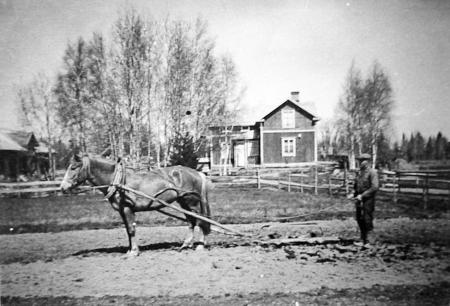Edvard Lithén (Kalles Edvard) (1891-1954). Bonde på en del av hustrun Ediths hemgård, Ström nr 3 i Singsby. Harvar åkern framför gården i "Möyrsvedin" 1944. Vistades några år i Amerika från 1909.