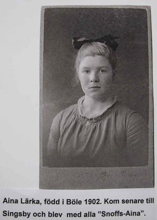 Aina Maria, född Lärka i Böle (1902-1991). Kom till Singsby och blev med alla 'Snofs Aina'. Gift med Hugo Bäck. Butiksbiträde några år vid nyöppnade Mustasaari Norra Handelslags filial i Singsby.