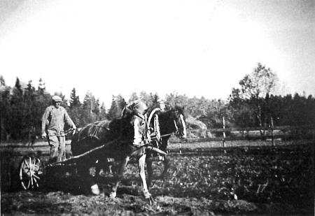 Eskil Dahl kör tvåhästars potatisupptagare i Möursveden 1948
