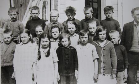 Elever uppställda för fotografering framför folkskolans entré 1927.