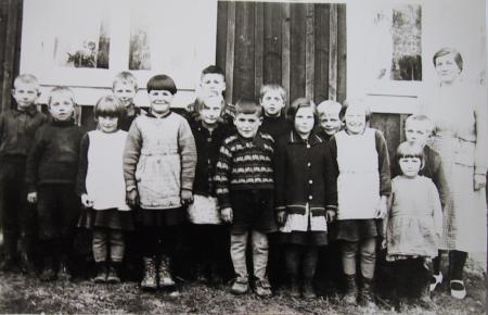Från vänster: ev. Helge Lax, Karl-Johan Lithén, Gunni Lithén, Stig Ström, Maj-Viol Pellas, Linda Rönn, Clas Pellas, Hilding Pellas, Uno Hjerpe, Eva Lax, Alvar Lithén, Göthild Lithén, Inga Ingman, Gustav E Lithén, Lärarinna: Elsa Nyholm.