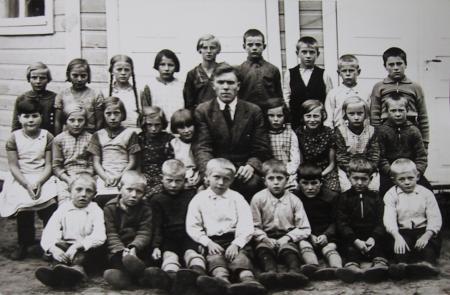 Skolelever 1934. Övre raden från vänster: Elvi Hjerpe, Ingegerd Lithén, Elin Syring, Margit Storm, Sally Hjerpe, John Lax, Uno Lax, Axel Hjerpe, Clas Pellas,