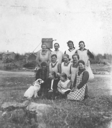 Damer samlade för fotografering på Uf-lokalens gård med Nysto-kvarnen i bakgrunden vid tiden för dess påbörjade nedmontering omkring 1925. Uppe från vänster: Siri Lax, Anna Hjerpe, Oline Hjerpe, Alice Järv.