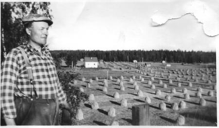 Lenis-Erik Storm på stugtaket tar en paus i arbetet med att reparera skorstenen. I bakgrunden Gösta och Linda Beijars hus