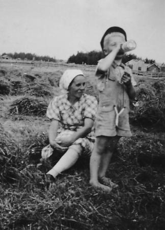 Adele Lund och sonen Rurik Ingmar (1936-) beväpnad med "Slongo" dvs slangbella på högsvenska.