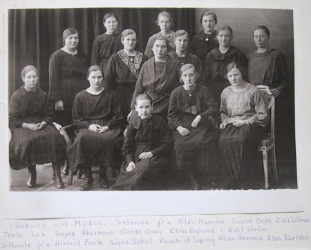 Stående: Barnskollärarinnan Elsa Nyholm, Sigrid Dahl, Edith Lithén, Tekla Lax, Signe Åkerman, Gerda Dahl, Elna Nylund, Edith Ström