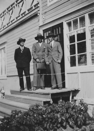 Tre gentlemän på trappan vid butiksägarnas privata ingång. Till vänster Tor Hägglund, till höger: Lennart Hägglund.