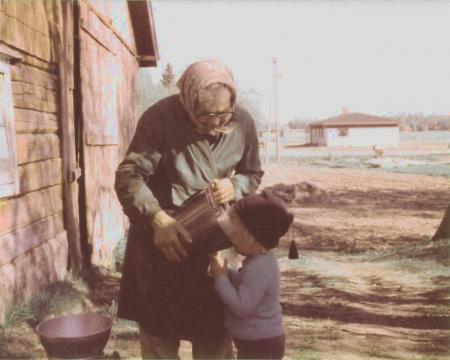 Farmor Oline Hjerpe bjuder Mikael på varm mjölk.