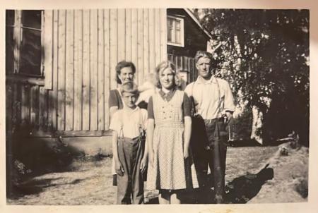 Familjen Hjerpe. Karl Fridolf* (1910-1989), Anna Oline* (1909-1989), Daisy Veneda Margaretha* (1934-2024), Karl-Einar Alfons (1937-1964), Henrik Ingvald* (1947-) skymtar i mammas famn.