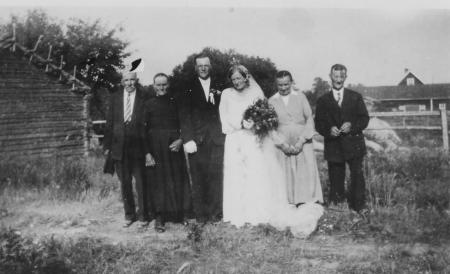 Erik Edvard Storm (1907-1988) gifter sig 1936 med Selma Sofia Ståhl (1909-2001) från Jungsund. Till vänster: Eriks föräldrar Johannes (1871-1947) och Erika, född Östergård (1871-1953) från Sundom. Till höger Selmas föräldrar Herman Ståhl (1880-1946) från Jungsund och Maria Sofia, född Mattas (1883-1954) från Jungsund.