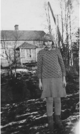 Liljen Engele* Lithén (1917-1997) framför "lillstögon" vid Kalles Hannesas. Brunnsvippon skymtar bakom Engele.