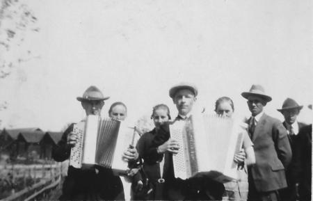 Dragspelare vid Anni och Evert Bäcks bröllop. Till vänster syns tre hus: längst till vänster Sabels uthus, i mitten likvagnshuset och till höger mangelhuset.