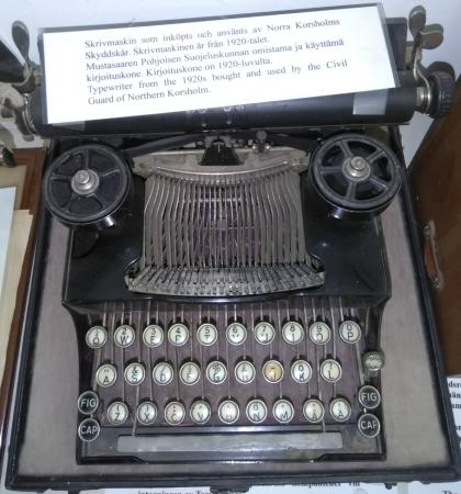 Skrivmaskin från 1920-talet som inköpts och använts av Norra Korsholms Skyddskår. Finns vid Krigsveteranmuseet i Vasa.