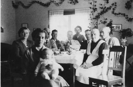 Från vänster: Signe Norrgård, f. Sabel - Karl-Eriks mor, Ros-Mari Norrgård, f. Öhling, gift med Karl-Erik, deras barn (troligen Sylvia Camilla Ulrika), Uno, Paul o Erik Sabel, Gunnel Westman, f. Norrgård, Karl-Eriks syster, Karl-Erik Norrgård, Ida Sabel, Axel Sabel
