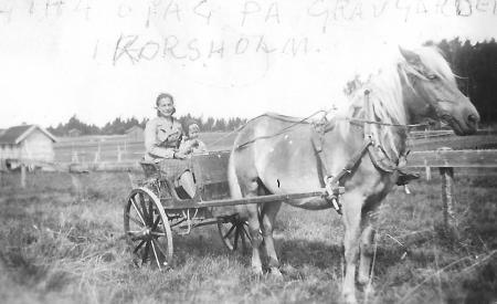 Nadine Linnéa* Hjerpe (1918-2005) med dottern Gitta och hästen Pian vid Korsholms gravgård. Linnéa var gift med Villiam Sjöberg från Monäs.