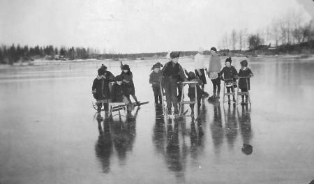 Singsbybarn på skrinnskor och med sparkstöttingar på översvämmad åker bakom nuvarande fotbollsplan 1932.
