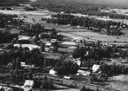 Flygfoto över centrum av Singsby. Till höger lite över mitten av bilden syns Hf-lokalen,