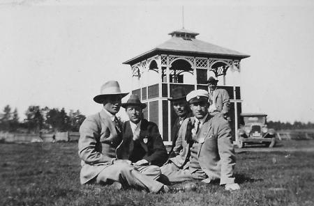 Se herrarna uppställda för fotografering. Mannen med studentmössa är Erik Sabel, till höger Einar Ström, de två övriga är John Vik och Edv. Järv (Järn?): Läs mera...