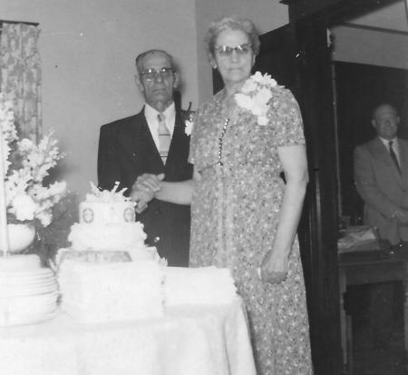 Richard Dahl (1881-1954) och Anna, född Hagström i Sverige, på deras 25-åriga bröllopsdag 1958. I bakgrunden skymtar Richards systerson Herbert Lilland (1904-1995)