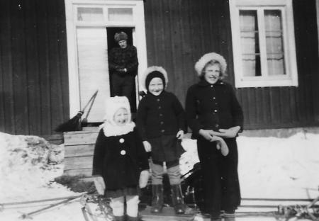 Hugo Dahl i dörren till sitt hus i Kärre. Barnen: Inger Christina* Dahl (1948-2020), Göta Iris* Ingeborg Dahl (1945-2021), Doris Alice* Åkerman (1940-).
