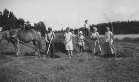 Höbärgning i Kalvholm. Jenny Kalfholms familjemedlemmar.