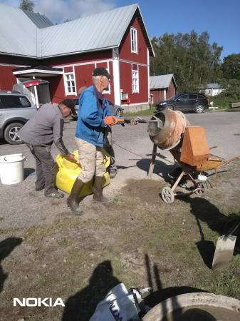 Grunden för nya flaggstången gjuts hösten 2024. Ingvald Hjerpe fyller betongblandaren. Kjell Berts och Håkan Norrgård assisterar.