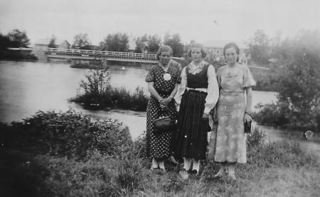 Tre damer vid en bro