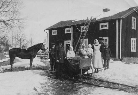 Gäster vid Störis i Singsby samlade runt en "tjibiko". Notera Nysto kvarn i bakgrunden.
