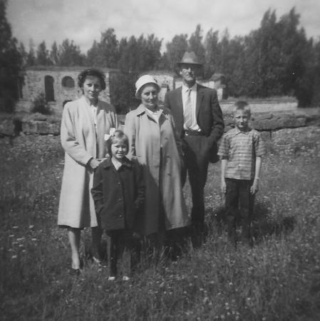 Till vänster Ingrid Sundheim från New York som besöker sin kusin Aina Ström i Singsby. Här vid Korsholms ruiner med Aina, Einar, Stina och Mikael Ström.