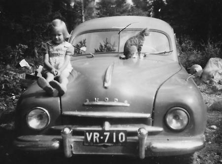 Viola Ström och en katt har tagit plats på "Limpo"-Skoda farmarens motorhuv.