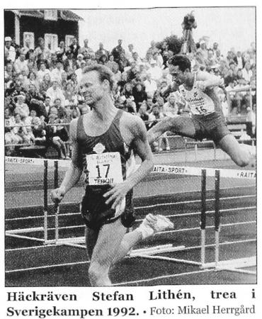 Stefan Lithén lägger beslag på bronsmedaljen i Finland-Sverige landskampen 1992 på 400 m häck.