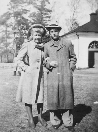 Uno Adolf Hjerpe (1925-) och Ingrid Gertrud* Jern (1926-1991) från Gerby. Fotograferade på gården vid Korsholms kyrka.