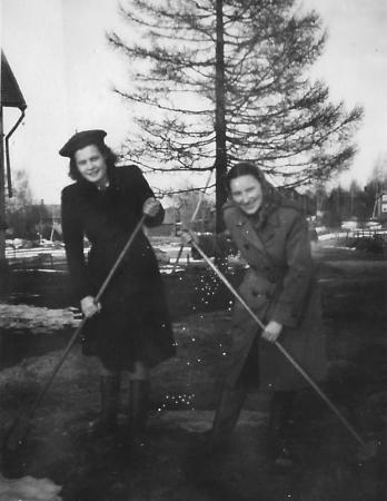Alice Dahl och Gunvor Ström i städtager på gården vid UF-lokalen.