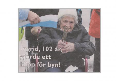 Ingrid Storm klipper det blåa bandet vid invigningen av cykelvägen Gerby-Singsby 2012.